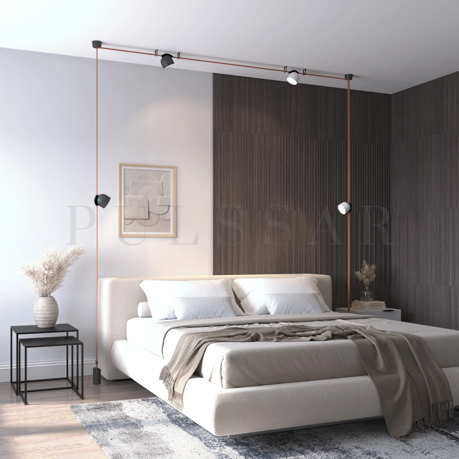 - Спальня. Здесь должно быть спокойно, поэтому продумайте мягкий, равномерно распределённый или локальный свет. Так, можно использовать спот или точечные модели с возможностью автономного включения элементов или их групп.