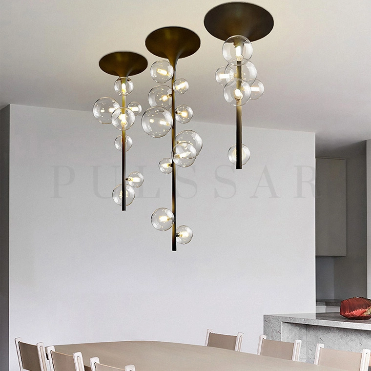 - Подвесные. В них лампочки в плафонах, абажурах или в оригинальных конструкциях крепятся на подвесах, например, тросах, цепях, трубках, канатах, штангах. Такие приборы часто используются для акцентного света, группами. Они больше подходят для помещений с потолками достаточной высоты: при небольшой создаётся эффект загромождения пространства.