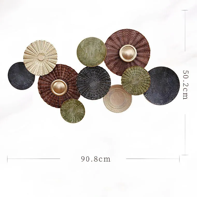 Настенный декор из металла в виде композиции из разноцветных дисков с рельефной текстурой и золотистыми акцентами
