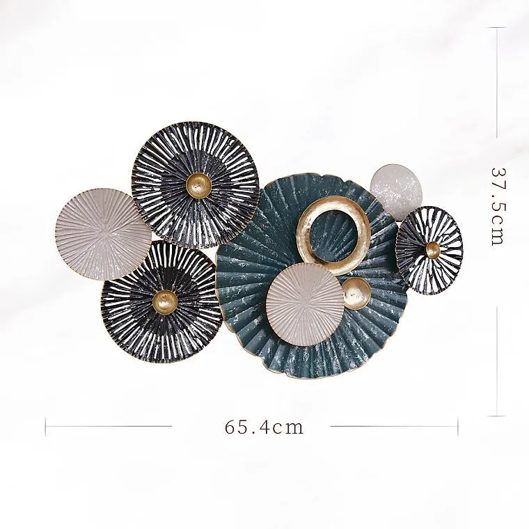 Настенный декор в виде композиции из металлических дисков разного размера с рельефной текстурой и золотистыми акцентами, напоминающий абстрактную цветочную инсталляцию