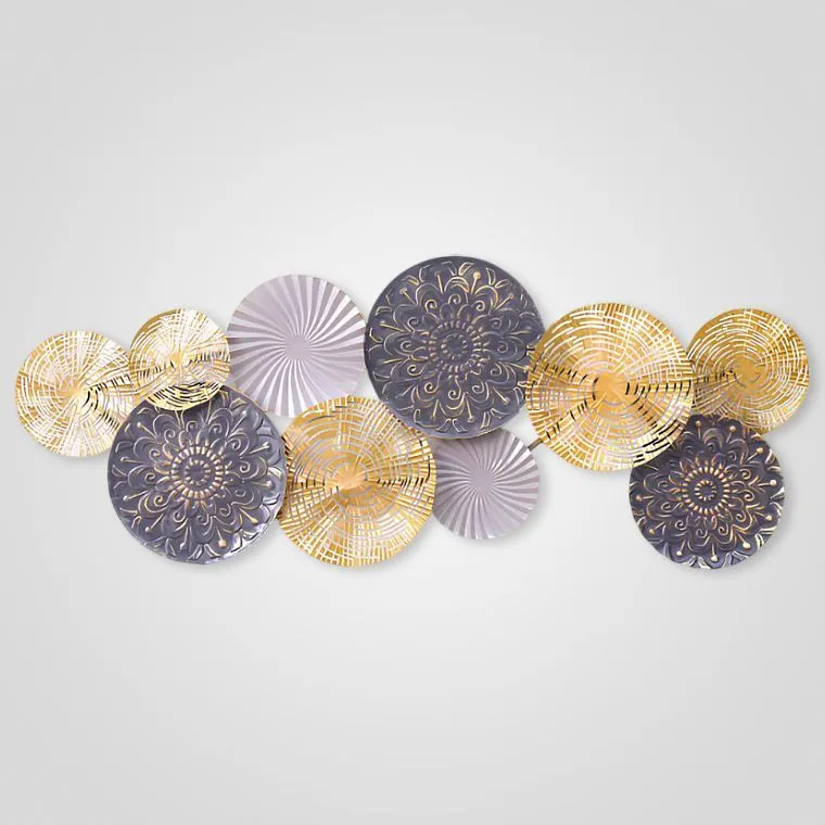 Настенное панно из металла выполнено в виде композиции из круглых элементов, украшенных тонким орнаментом и текстурными узорами, которые гармонично сочетают золотистые и серо-фиолетовые оттенки, создавая эффектный декоративный акцент