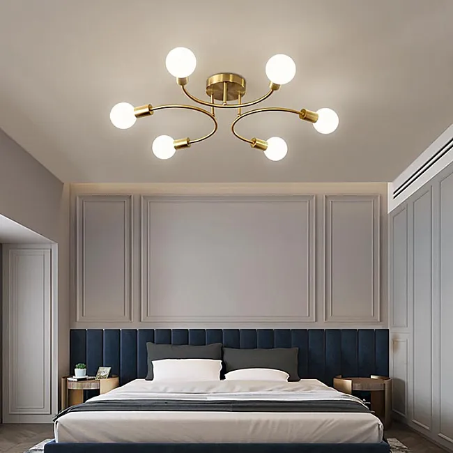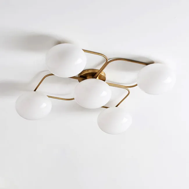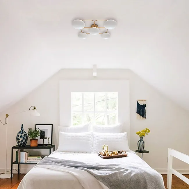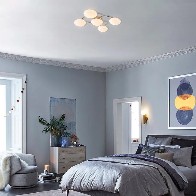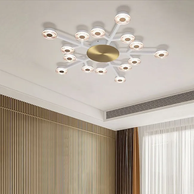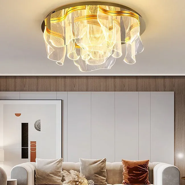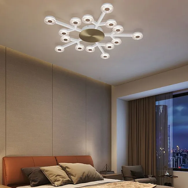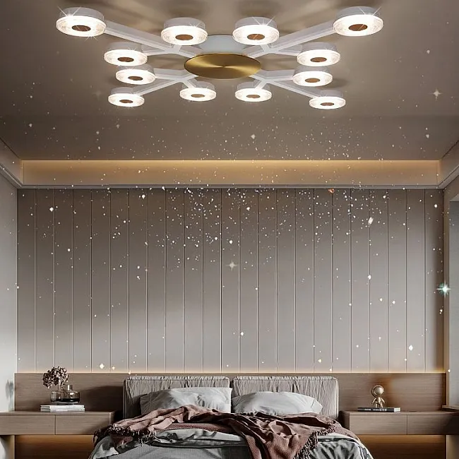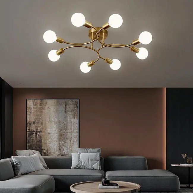 Вторая особенность – рассеянный, не напрягающий и достаточный свет. Он обеспечивается либо материалами с необходимой степенью прозрачности, либо одним или несколькими плафонами оптимальной формы (конической, полусферической, купольной). При таком исполнении лучи равномерно рассеиваются по пространству. Обычно предусмотрено несколько лампочек. Они чаще светодиодные: безопасные, экономичные с точки зрения энергопотребления, долговечные и излучающие комфортный и безвредный для зрения, мягкий свет.