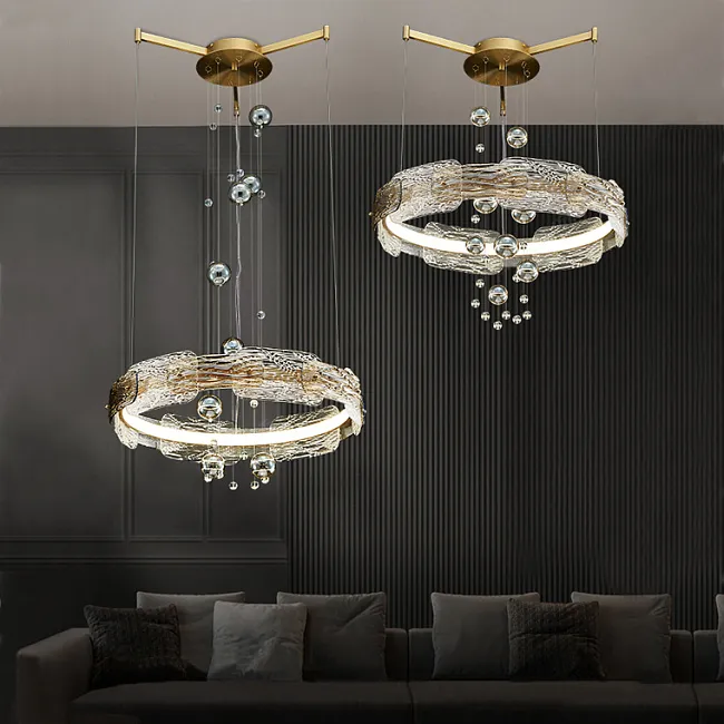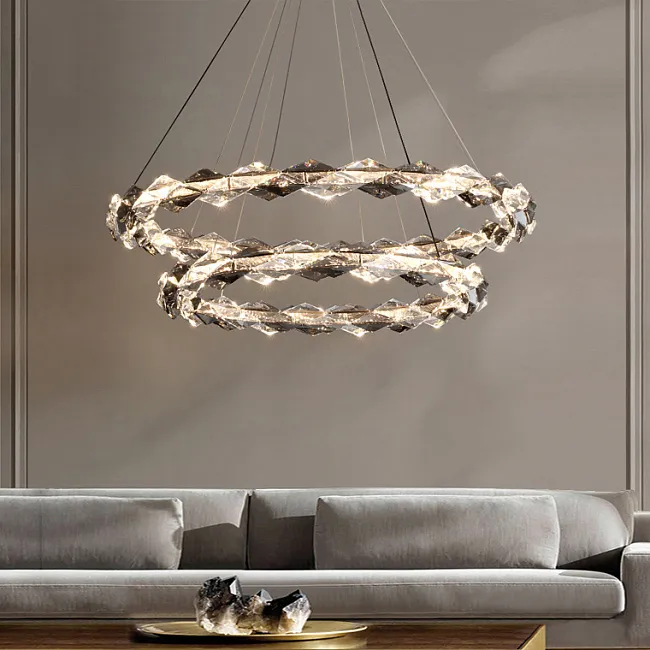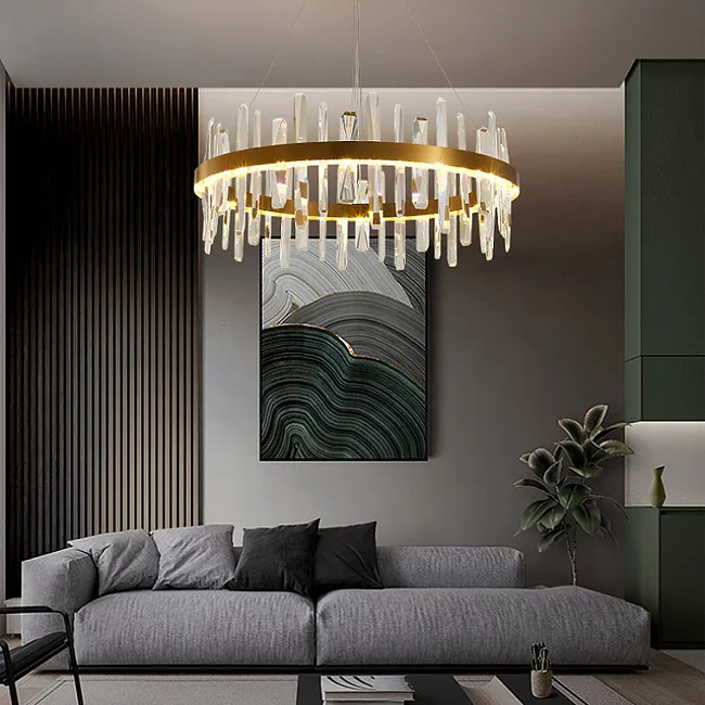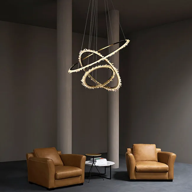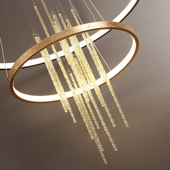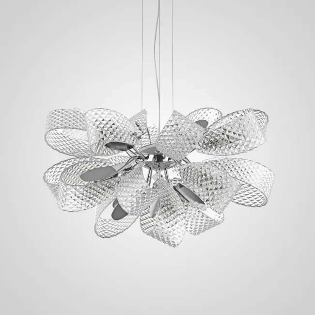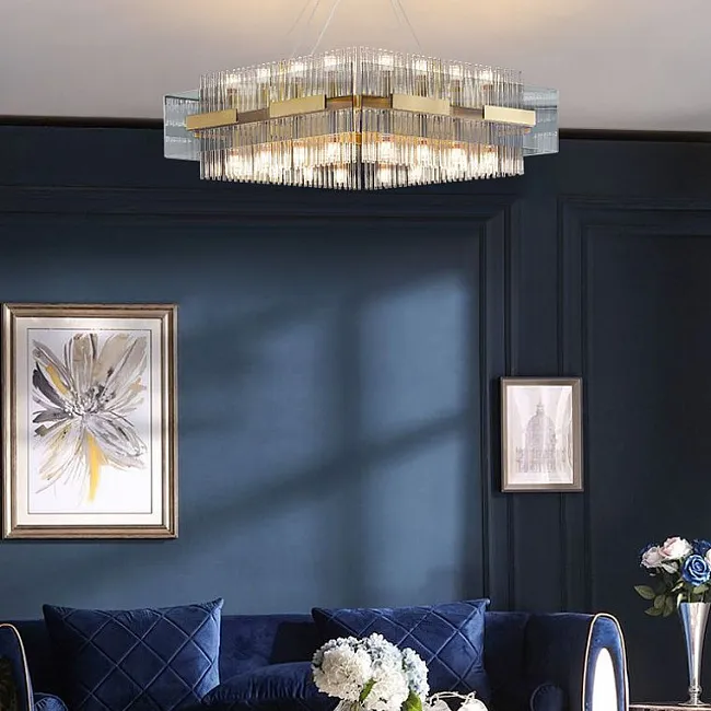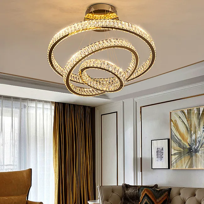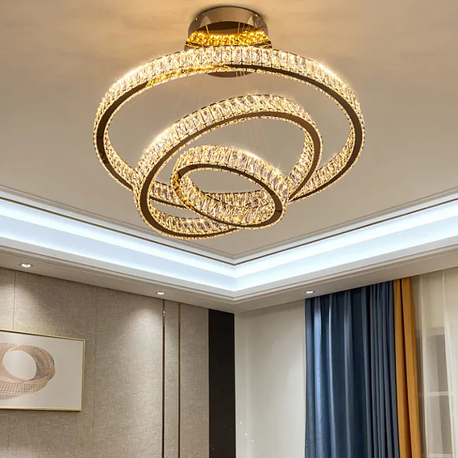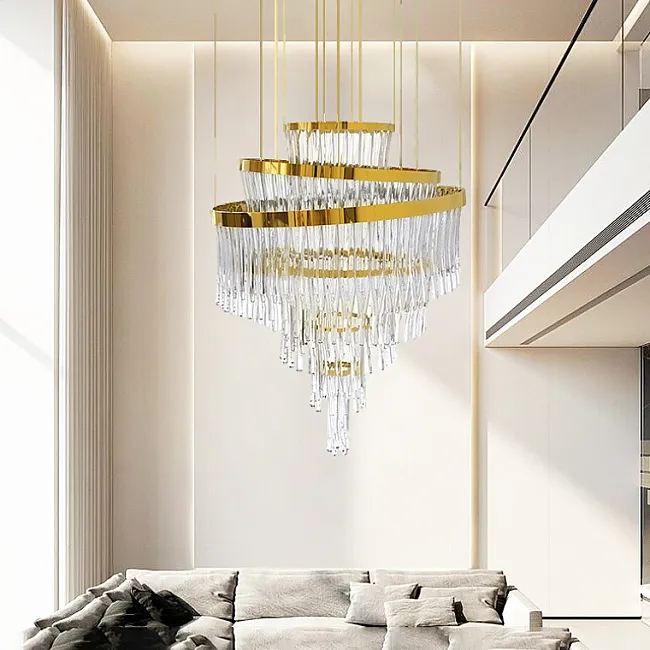 Популярны длинные люстры для лестниц и лестничных пролётов. Потолочная модель монтируется вплотную к потолку и обычно имеет основание с лампочками, с которого свисают рассеиватели, например, хрустальные или стеклянные стержни, подвесы.
