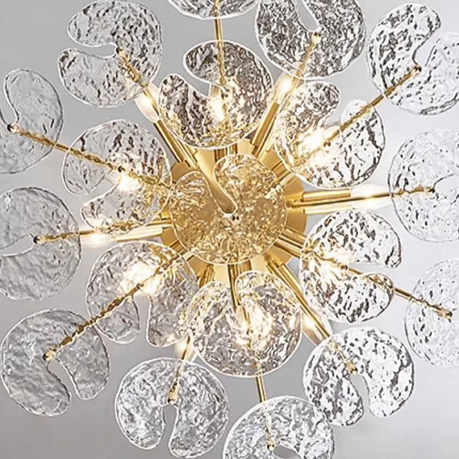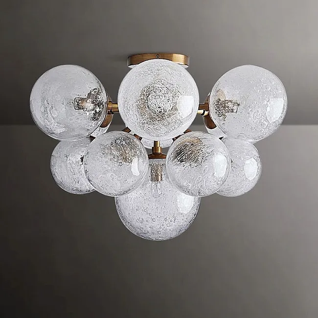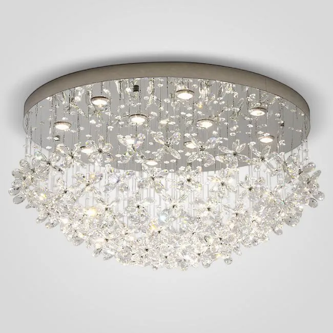 Есть люстры с разным количеством лампочек и с плафонами различных форм, например, сферической, цилиндрической, полусферической, кубической, кольцевой, дугообразной, конической, купольной, бокаловидной, а также с подвесками, в виде стержня, листа, овала, пластины, свечи, ромба, цветка.