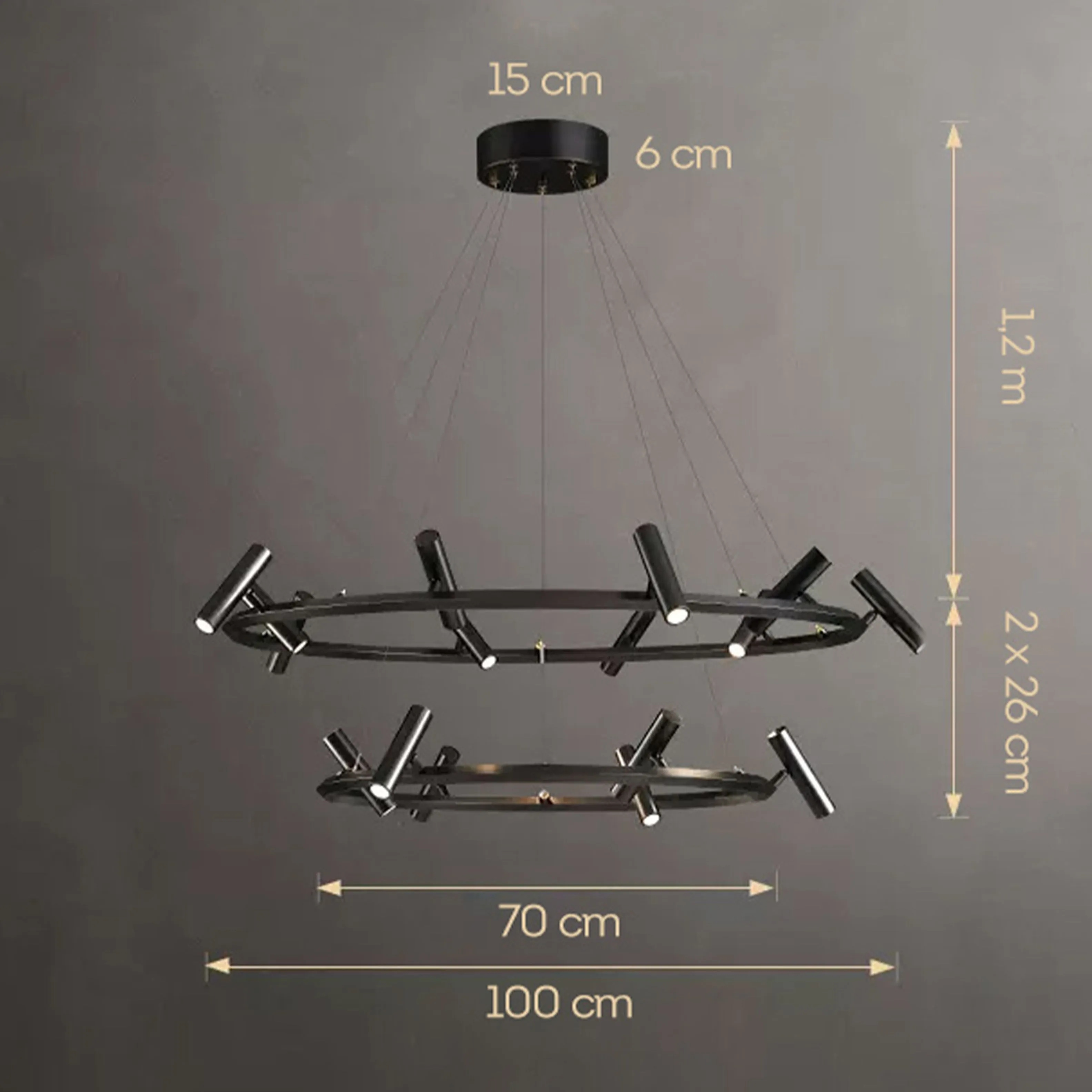 Люстра в двух комплектациях - на одно кольцо и на два кольца, что позволяет выбрать наиболее подходящий вариант для вашего помещения. Вариации на 6 ламп мощностью света 12W - Ø 70 × 26 см, на 8 ламп мощностью света 16W - Ø 80 × 26 см, на 10 ламп мощностью света 20W - Ø 100 × 26 см, на 6 + 10 ламп мощностью света 32W - Ø 70 × 26 см + Ø 100 × 26 см.