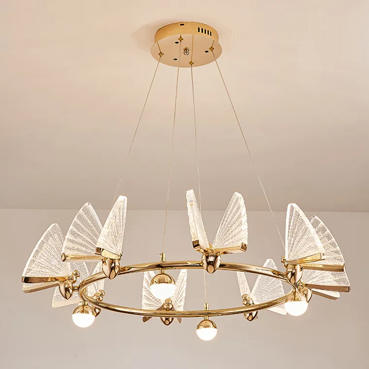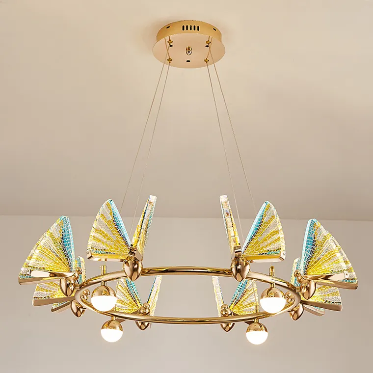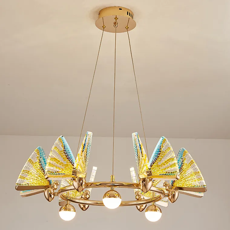Особенностью данной модели является форма плафонов в виде кольца и бабочки с прозрачными или разноцветными крыльями. Люстры представлены в золотом цвете каркаса. Благодаря материалу изготовления – металлу и акрилу – эти люстры отличаются прочностью и долговечностью.