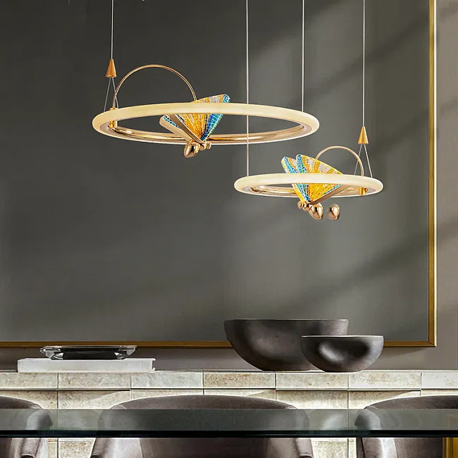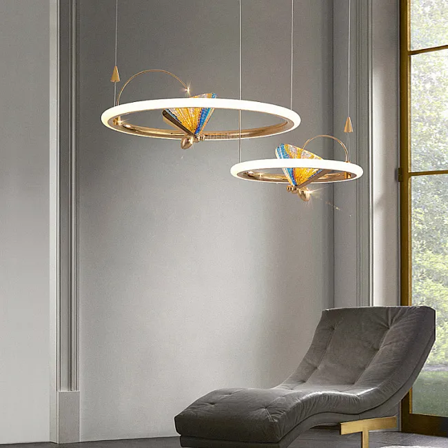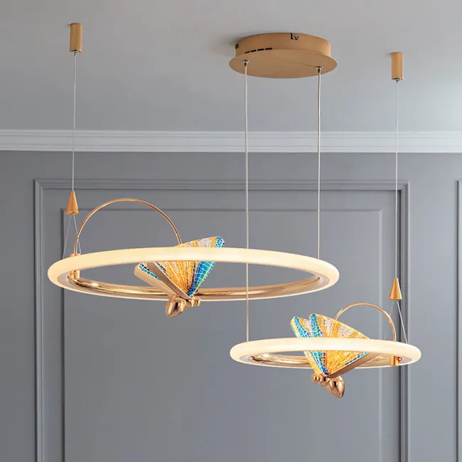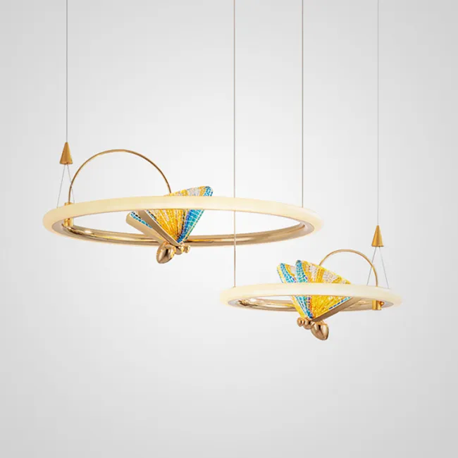 Особенностью данной модели является форма плафонов в виде кольца и бабочки с прозрачными или разноцветными крыльями. Люстры представлены в золотом цвете каркаса. Благодаря материалу изготовления – металлу и акрилу – эти люстры отличаются прочностью и долговечностью.