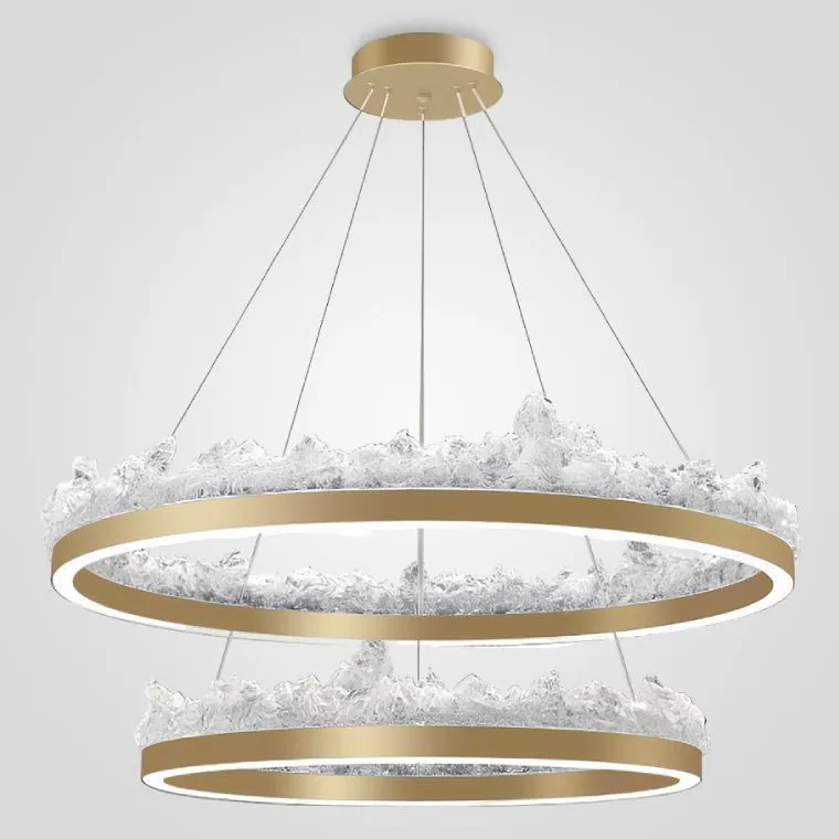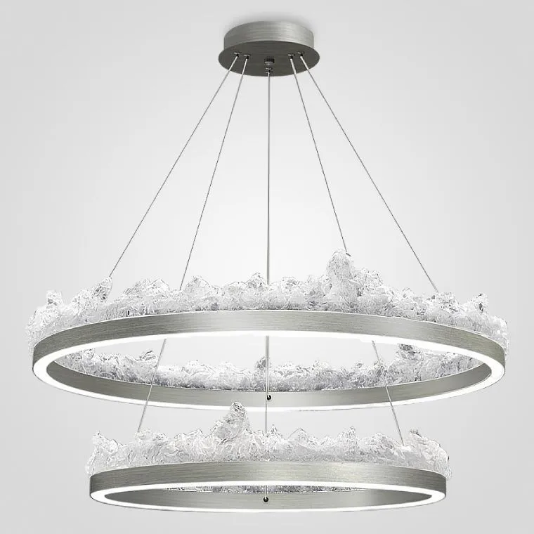 Вместе с тем, два размера – 60 и 80 см – позволяют адаптировать люстру под любое пространство, а каскадная версия из двух колец (60 и 80 см) дарит возможность создать многослойное и динамичное освещение. Намеренно направленный вверх рассеиватель из полимера, выполненный в виде льда, обеспечивает мягкое и уютное свечение, создавая неповторимую атмосферу.