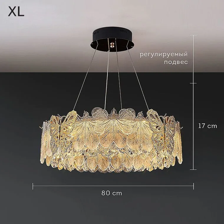 Серия подвесных люстр с декором из хрустального стекла и ажурного металла на кольцевом каркасе. Кольцо света, окольцованное… бабочками! Сотни стеклянных бабочек, словно только что взмахнувших крыльями, застыли в танце, образуя многослойный, завораживающий узор. Их крылья – рельефные, живые, играющие светом, словно пойманные в момент преображения.