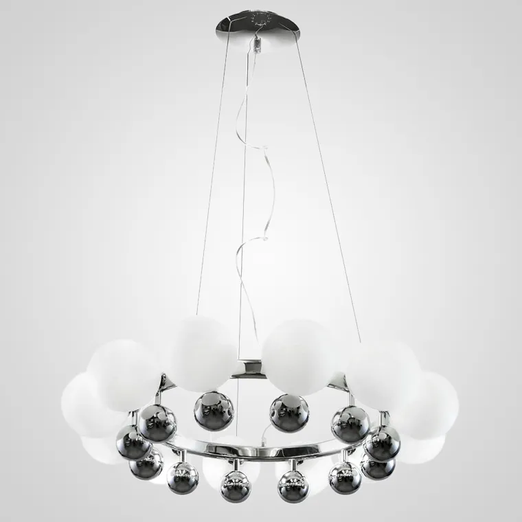 Серия кольцевых люстр на хромированном каркасе с белыми шарообразными плафонами и декором из металла