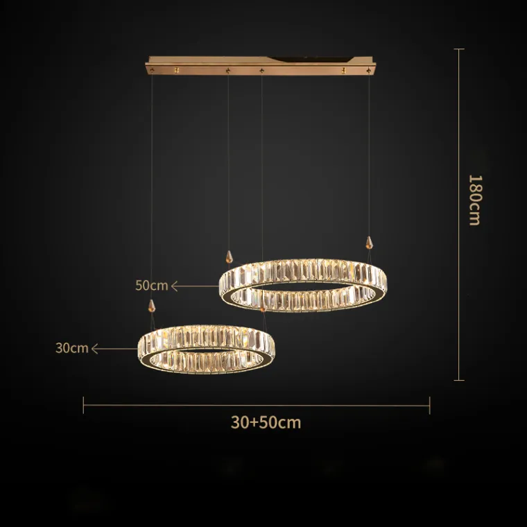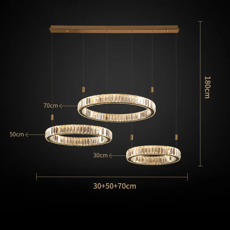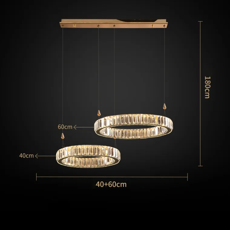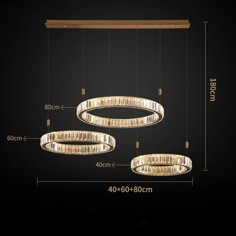 Люстра Bertolda L — стильное дизайнерское освещение для современных интерьеров. Конструкция выполнена в виде композиции из колец разного диаметра, украшенных прозрачными хрустальными рассеивателями. Элементы из металла и стекла придают люстре изысканный блеск и визуальную лёгкость.