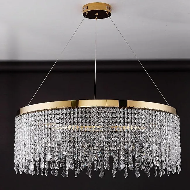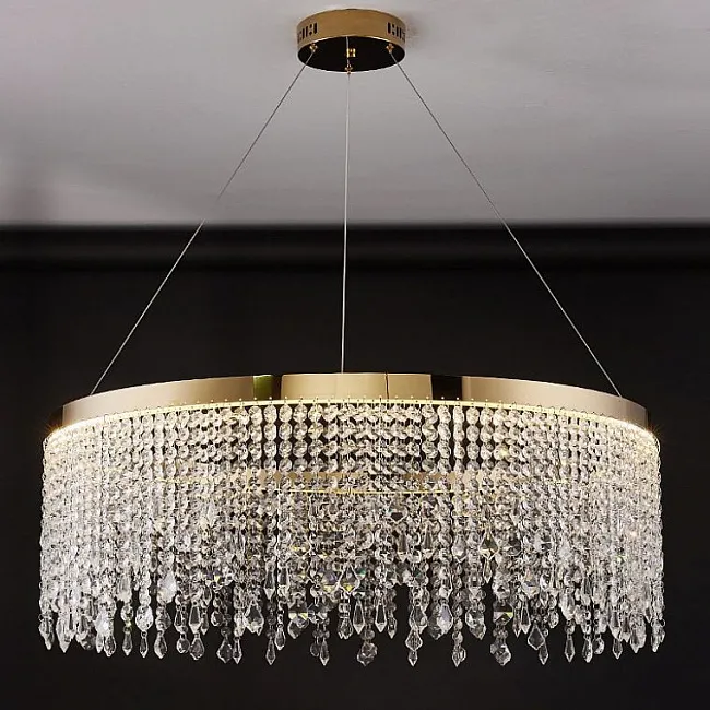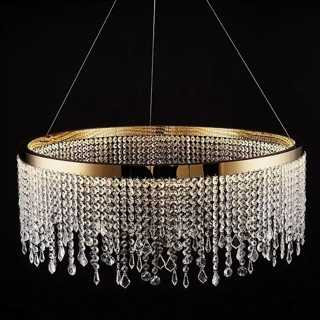 Каркас из золотых трубочек - он словно лучи солнца, проникающие сквозь окна, создает эффект пленительной атмосферы. Многослойные хрустальные подвесные пластины сочетают в себе игру света и отражений, разлетаясь мириадами искр, словно магический горошек, при каждом движении фантастики.