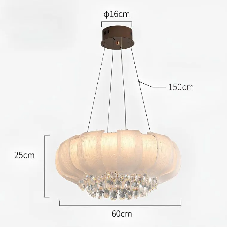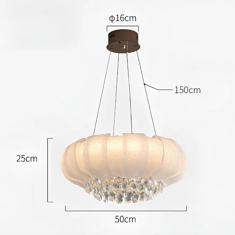 Серия кольцевых люстр с изогнутыми вверх пластинчатыми рассеивателями в виде лепестков и многослойным декором в виде хрустальных подвесок