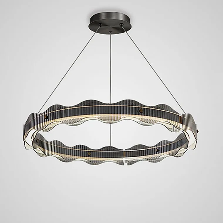 Кольцевая люстра в матовом чёрном корпусе украшена рельефными рассеивателями серо-дымчатого оттенка, которые напоминают волны и создают эффект живого света, создавая завораживающий и неповторимый образ. Рассеиватели, словно волны, нежно обтекают кольцо, превращая каждое помещение в сказочное место, где царит гармония и уют.
