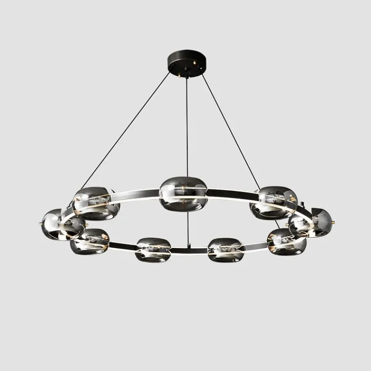 Серия светодиодных кольцевых люстр с декоративными дымчатыми плафонами из стекла ручной работы и двунаправленным светом по контуру каркаса. Погрузитесь в уникальную атмосферу, созданную серией светодиодных люстр с дымчатыми плафонами из стекла ручной работы на лучевом каркасе и двунаправленным светом. Черный латунный корпус с расходящимися в стороны лучами направляющими придаст вашему интерьеру неповторимость.