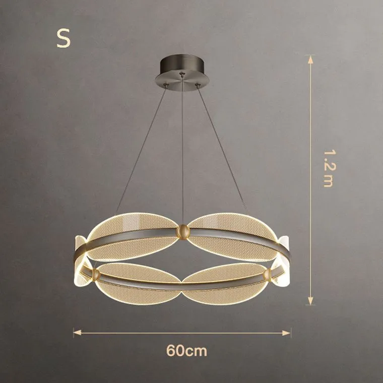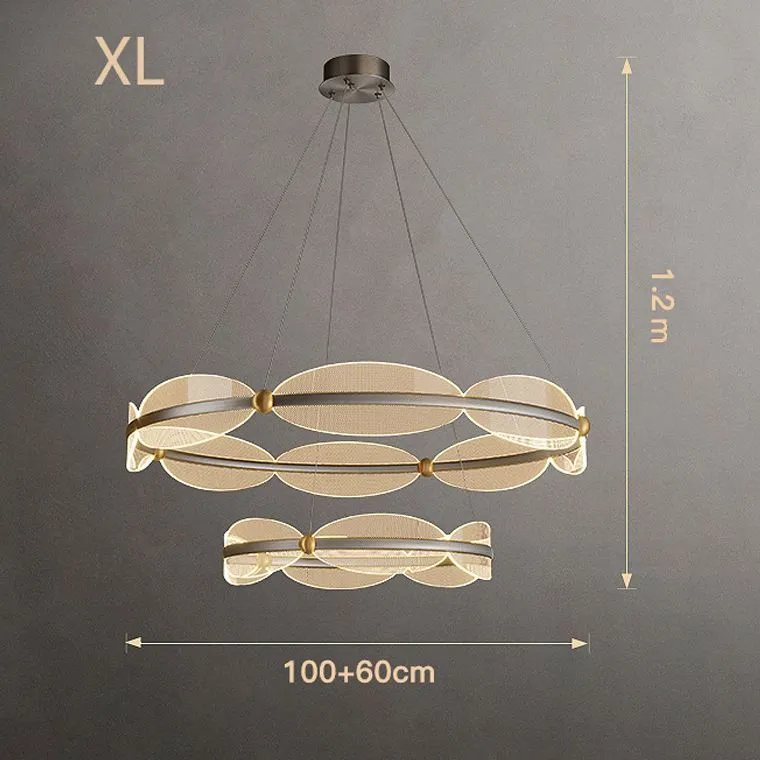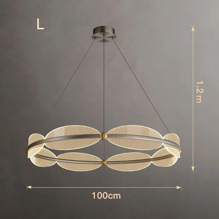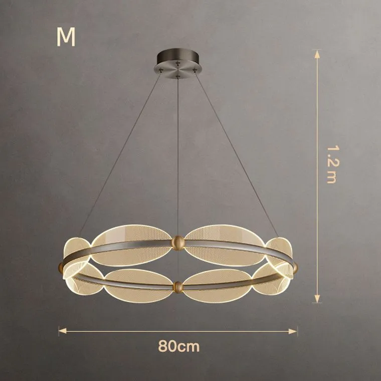 Изящные плафоны в виде овальных листьев с точечным узором изготовлены из акрила и расположены по кольцу так, что создают эффект легкости и динамики. Визуальная композиция напоминает лёгкий воздушный поток — элегантный, живой, и при этом строго упорядоченный.