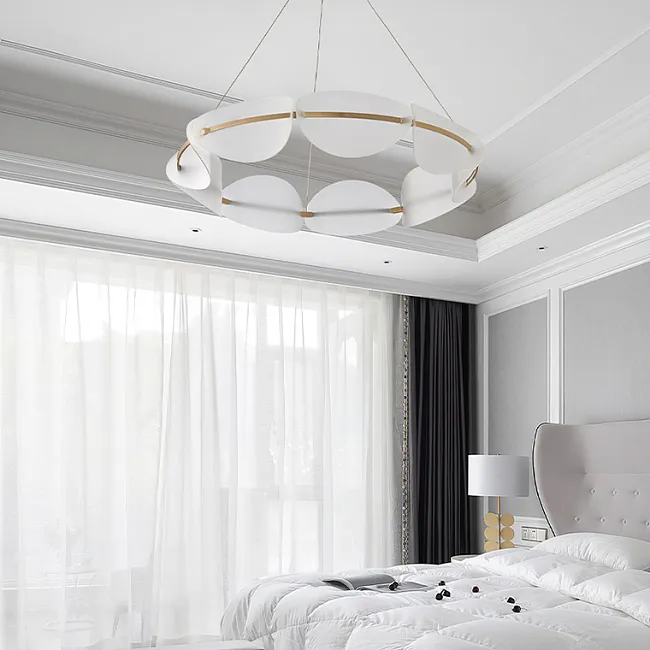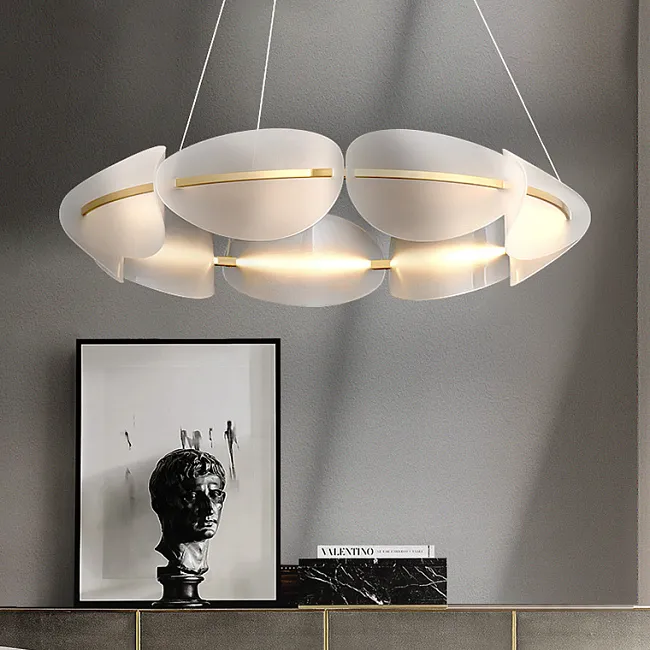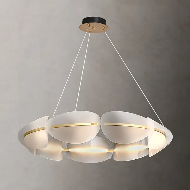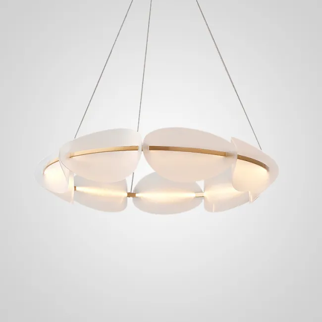 Изящные плафоны в виде овальных листьев с точечным узором изготовлены из акрила и расположены по кольцу так, что создают эффект легкости и динамики. Визуальная композиция напоминает лёгкий воздушный поток — элегантный, живой, и при этом строго упорядоченный.