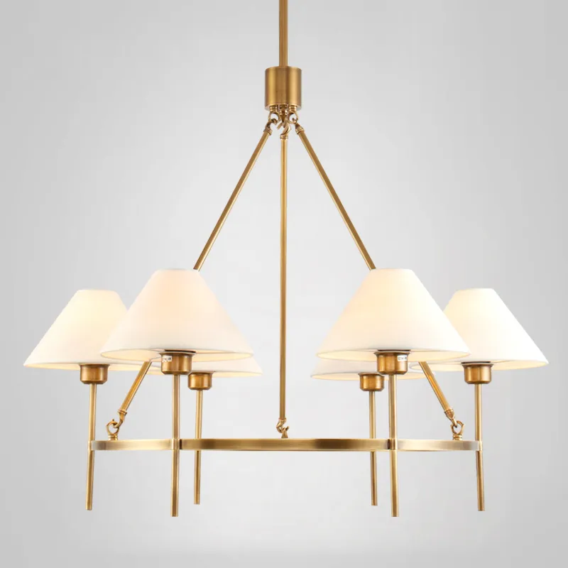 Кольцевая люстра из коллекции FAREL отличается функциональностью и практичностью. Каркас из латуни и белые текстильные плафоны, создавая непринужденную атмосферу, добавляют обстановке тепла и уюта. Модель отлично впишется в современный дизайн интерьера, эффектно подчеркнет постмодерн или классический стиль. Люстра может использоваться, как единственный источник света в помещении или комбинироваться с другими осветительными приборами.
