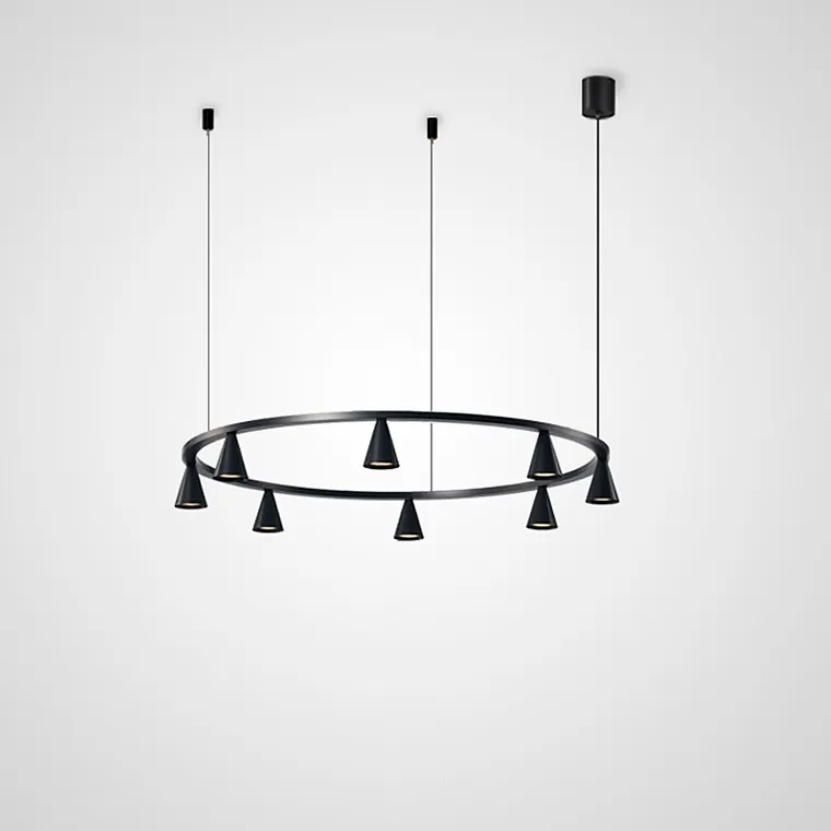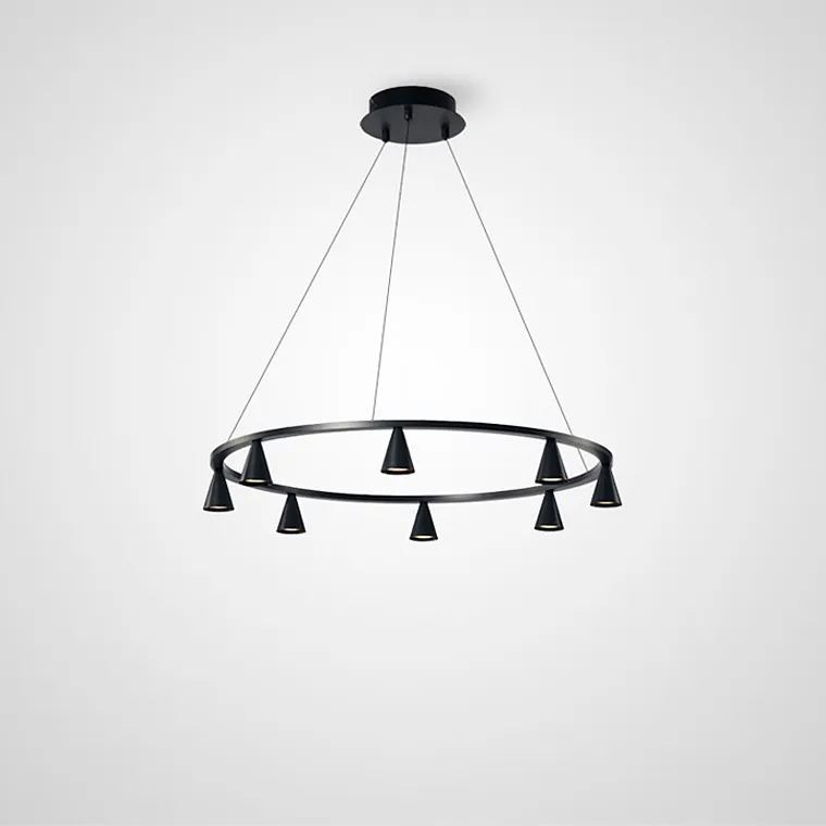 Серия светодиодных люстр с направленными книзу коническими плафонами на черном кольцевом корпусе