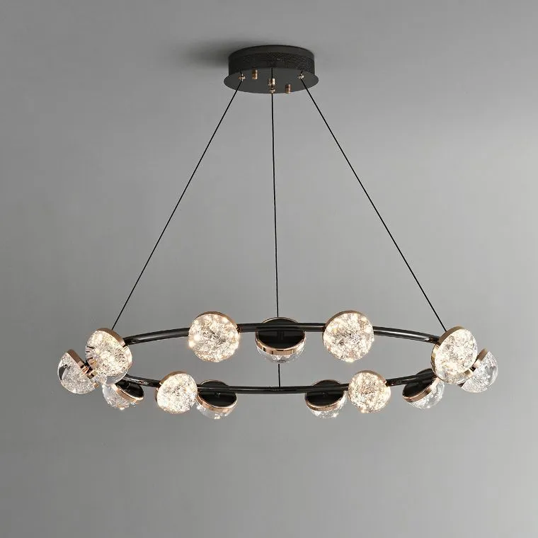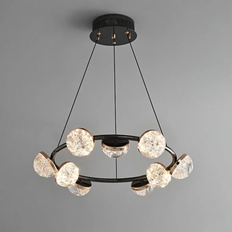 Корпус светильника выполнен в элегантном минималистичном стиле, сочетающем глубокий черный и роскошное золото. Это комбинированное решение придает светильнику современный и утонченный вид, делая его идеальным дополнением к любому интерьеру. Полусферические плафоны из прозрачного акрила с детализированным эффектом льда добавляют интерьеру свежести и легкости, создавая уютную атмосферу в вашем доме.