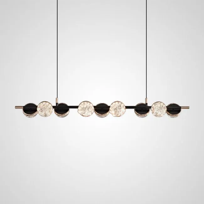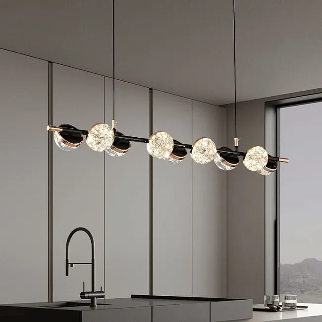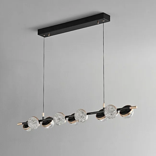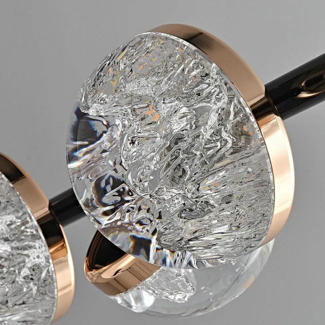 Корпус светильника выполнен в элегантном минималистичном стиле, сочетающем глубокий черный и роскошное золото. Это комбинированное решение придает светильнику современный и утонченный вид, делая его идеальным дополнением к любому интерьеру. Полусферические плафоны из прозрачного акрила с детализированным эффектом льда добавляют интерьеру свежести и легкости, создавая уютную атмосферу в вашем доме.