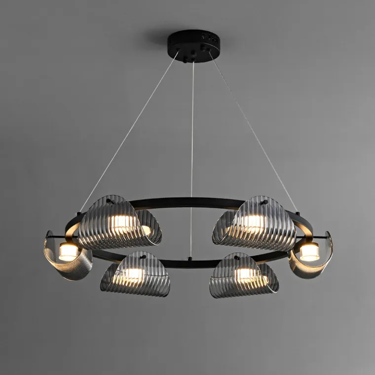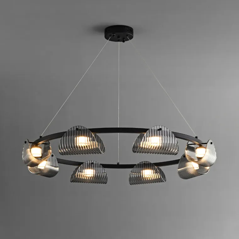 Серия кольцевых светодиодных люстр с изогнутыми рельефными рассеивателями из дымчатого стекла