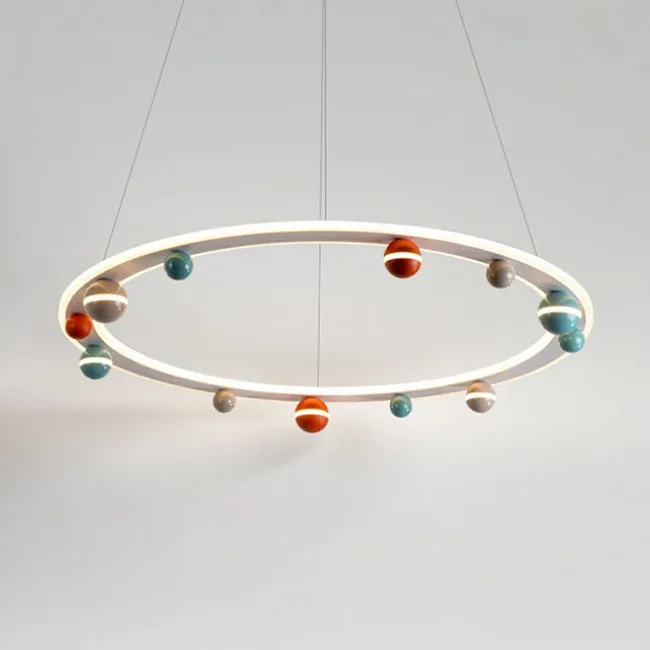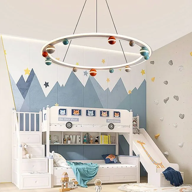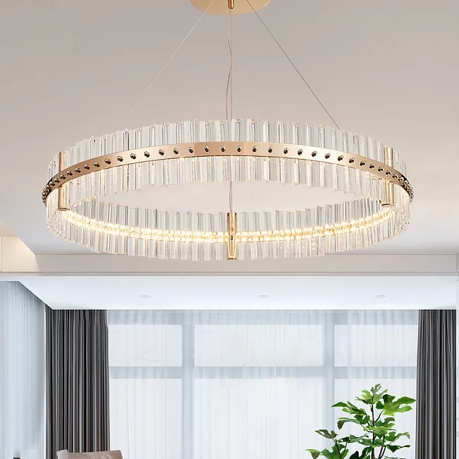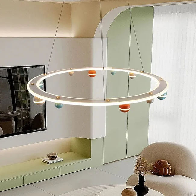 Если у вас потолки высокие, очень советую подвесную люстру Гедеон! У меня гостиная огромная, поэтому выбрал 10 ламп. Дизайнеру на самом деле респект – такое придумать, талант нужен. Тут и кольца, которые снаружи горят, и ещё плафоны трубки, они тоже светятся. Свет получается на разных высотах, поэтому вся большая комната освещена очень хорошо – стены, пол и потолок.