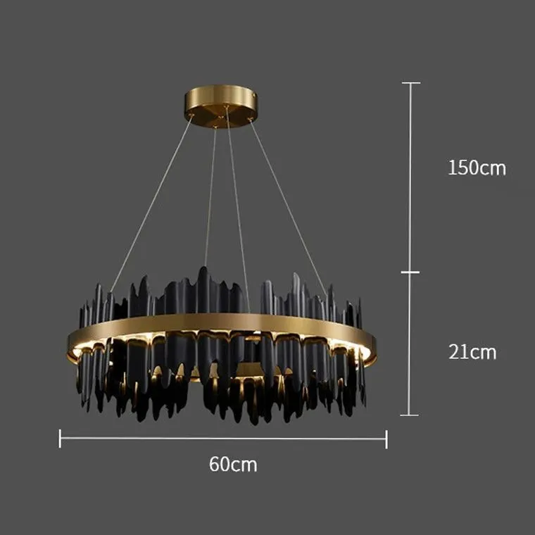 Все изогнутые рассеиватели «Flame Wave» выполнены из латуни, что придает им благородный вид и добавляет шарма всей конструкции. Черный корпус и струнный подвес усиливают эффект элегантности и современности, делая эти люстры идеальным решением для гостиной или кухни.