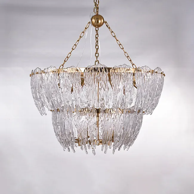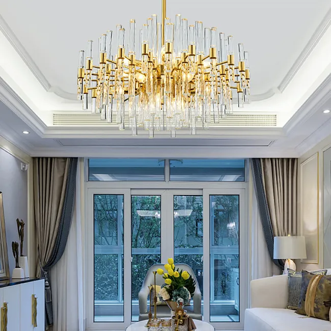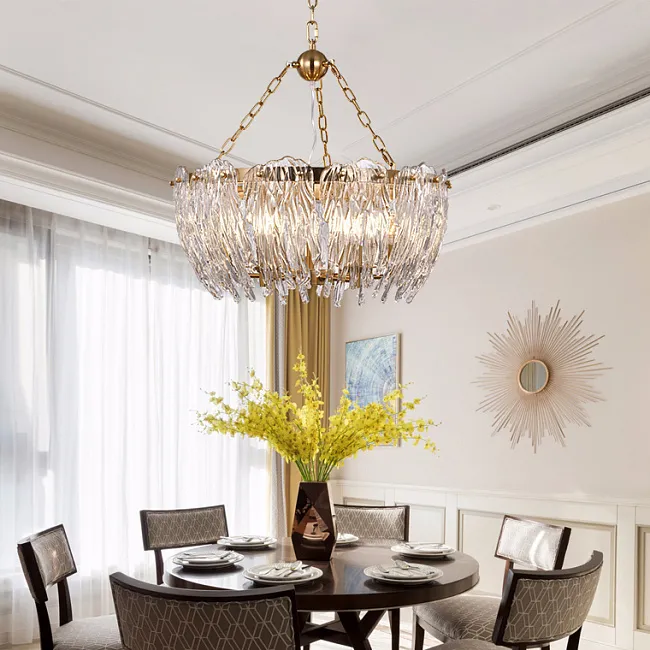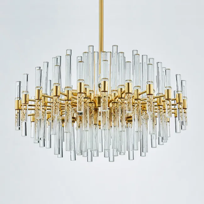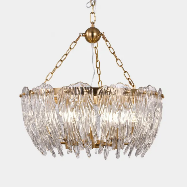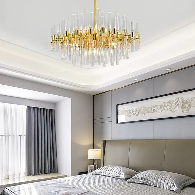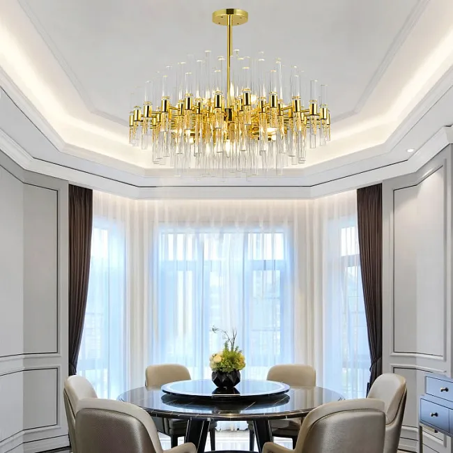 Каркас из золотого металла формирует основу для красивых хрустальных пластин, расположенных по всему контуру кольца. Эти пластины напоминают корону и придают люстре роскошный вид. Сочетание света, отражаемого хрусталем, и золотого каркаса создает элегантное и изысканное освещение в вашей комнате.