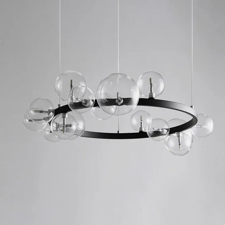 Дизайнерская кольцевая люстра выглядит необыкновенно и волшебно, хотя в ней нет ничего особенно сложного. Она состоит из обыкновенных стеклянных круглых плафонов и большого каркаса в виде кольца. Всё дело в асимметричном расположении плафонов и их разном диаметре, которые делаю светильник похожим на эффектное скопление мыльных пузырей. Такая люстра весьма органично впишется в любой современный интерьер и станет достойным его дополнением.