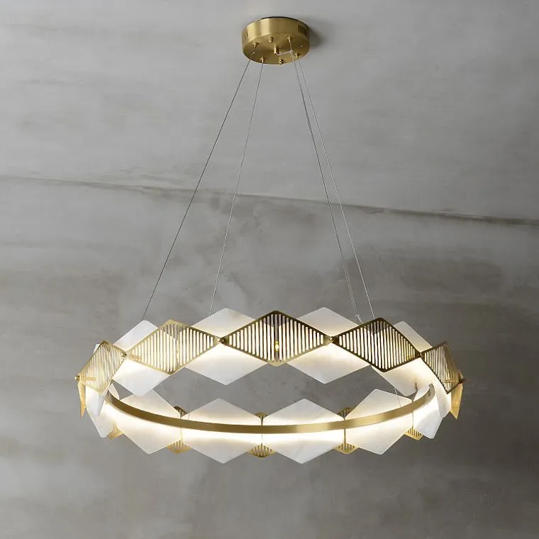 Каркас кольца выполнен в латунном цвете, что придает ему особую изысканность. Натуральный испанский мрамор, используемый в виде рассеивателей ромбов, добавляет изящество и придает освещению утонченность. Мрамор обладает особым шармом и олицетворяет роскошь и изысканность.