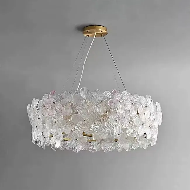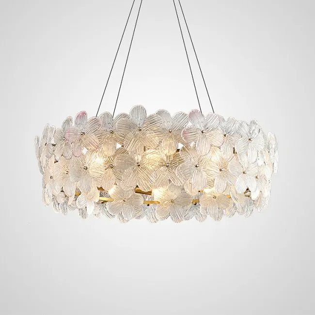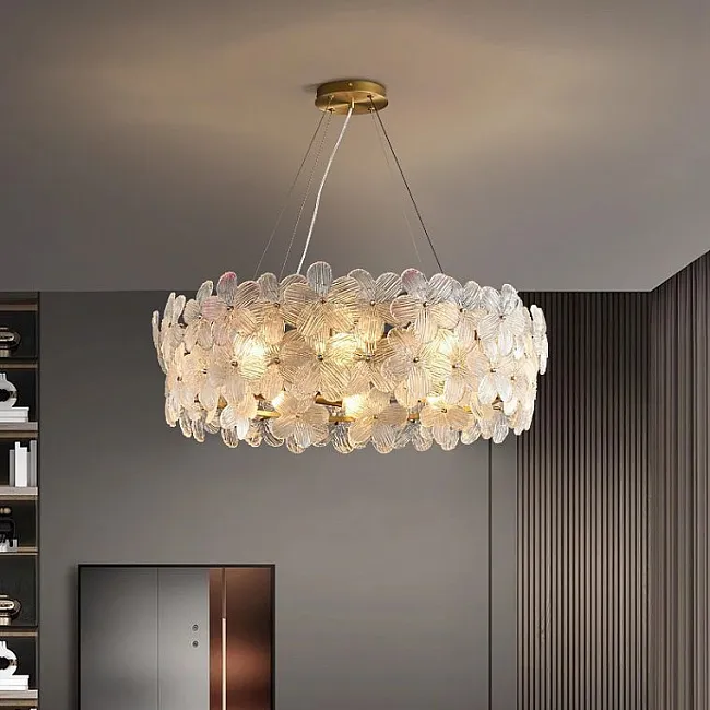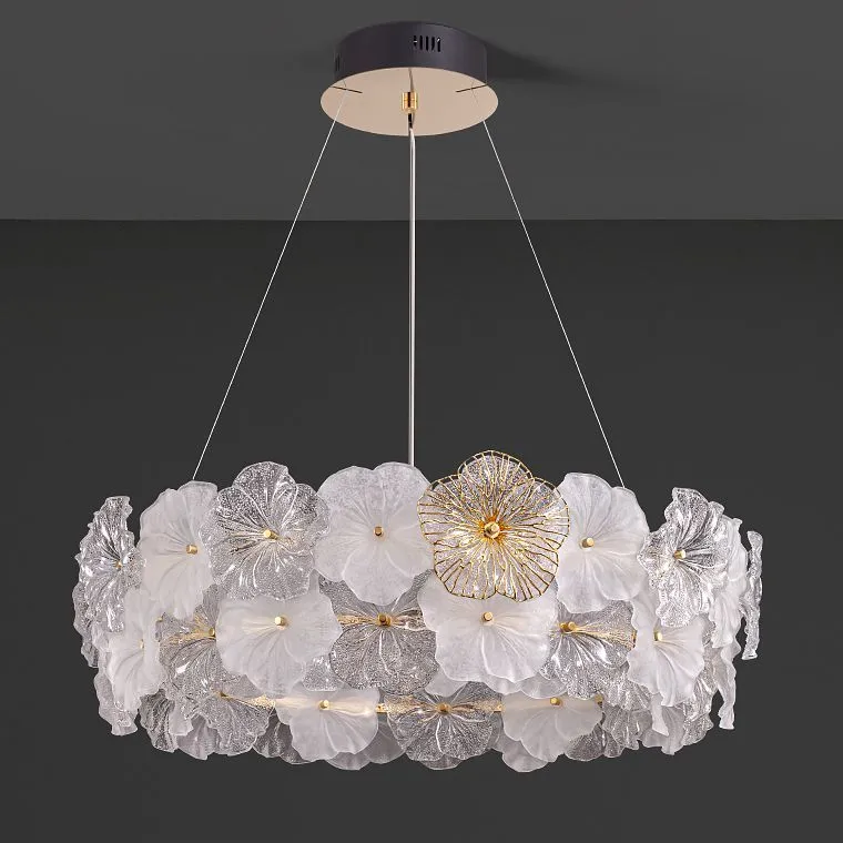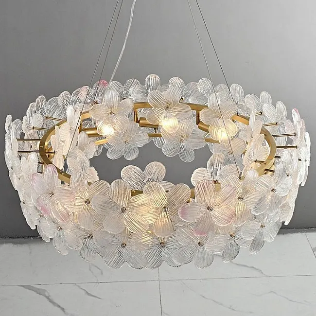 Серия светодиодных люстр с цветочным декором из металла, прозрачного и матового стекла на кольцевом каркасе