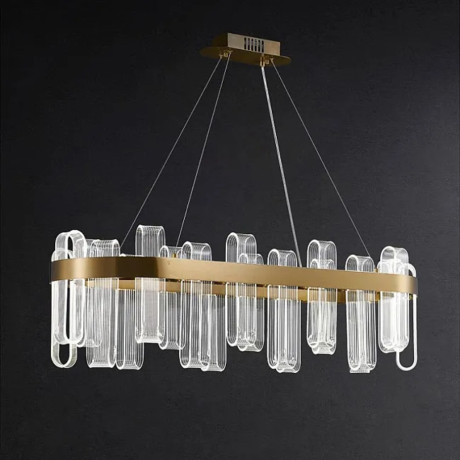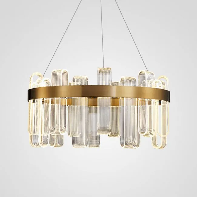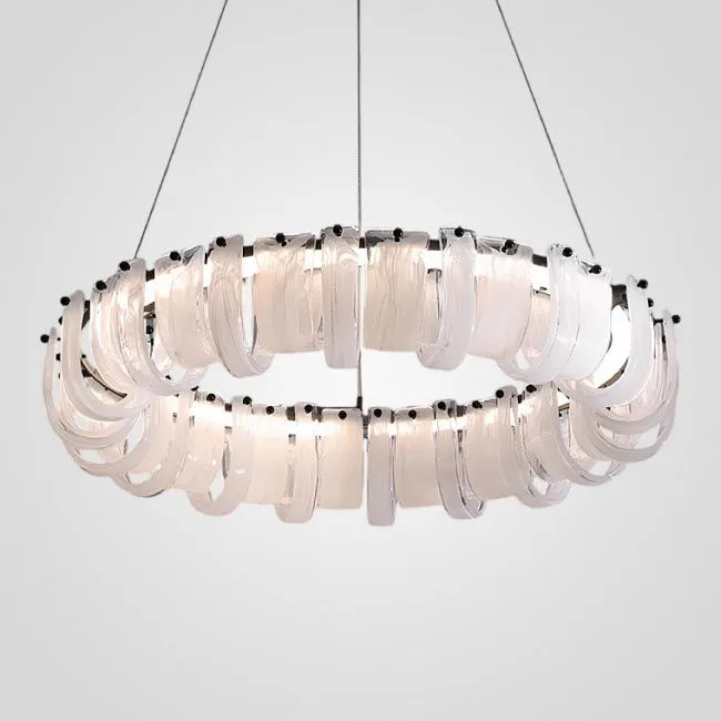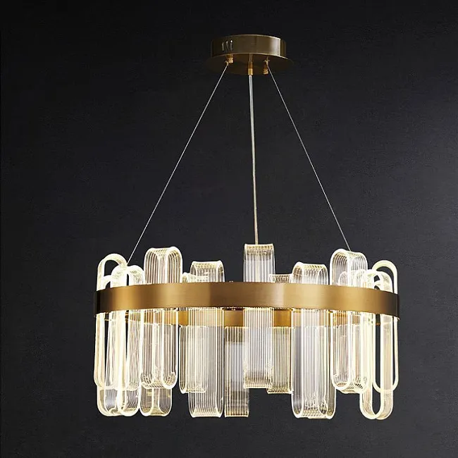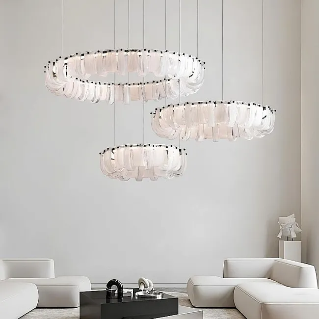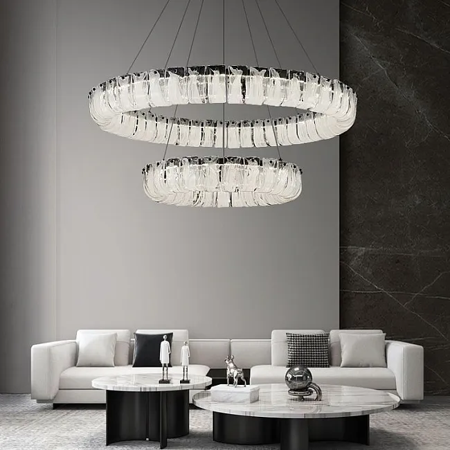 Серия светодиодных люстр на кольцевом каркасе с рельефными акриловыми рассеивателями изогнутой формы и металлическим корпусом