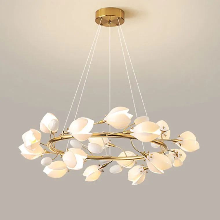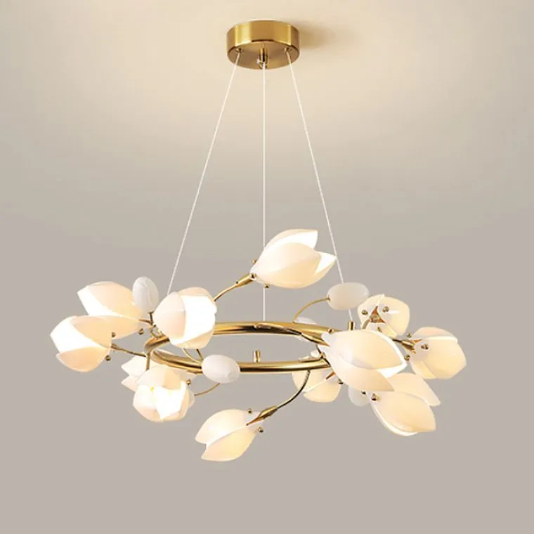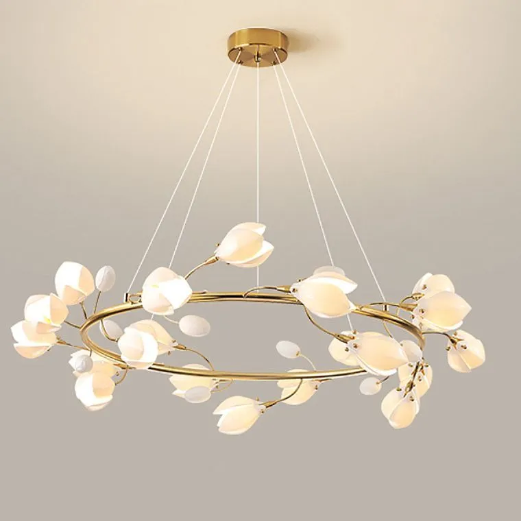 Люстры JULYс плафонами в виде белоснежных цветов, аккуратно размещенных на кольцевом и реечном каркасах, создадут атмосферу небывалой легкости и изыска в интерьере. Люстры имеют корпус латунного цвета, который добавляет нотку благородства и утонченности, а керамические плафоны в форме бутонов цветов напоминают о свежести весеннего утра. Струнный подвес позволяет легко отрегулировать высоту люстры, обеспечивая идеальное освещение именно для вашего пространства.