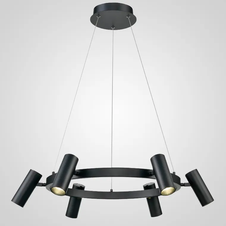 Современные светильники от молодых дизайнеров не бросаются в глаза, но задают тон всему интерьеру. Люстра KOBUS словно парит под потолком. На тонких проводах держится металлический обруч с плафонами удлиненной цилиндрической формы. Светодиодные светильники поворачиваются в любом направлении. Если купить люстру кольцевую KOBUS в России недорого, ее мягкий свет и оригинальный дизайн станут отличным решением для освещения обеденных зон.