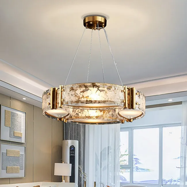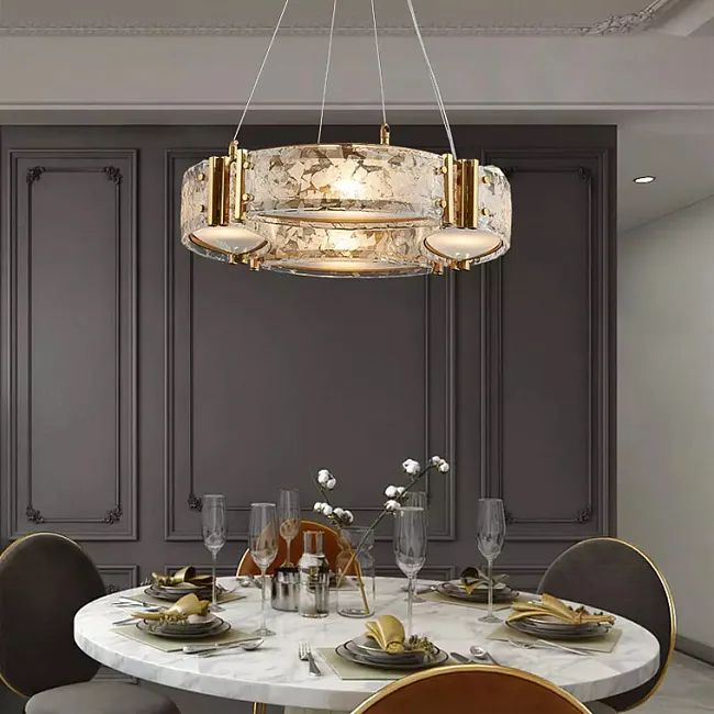 Кольцевой светильник с чередующимися мраморными и хрустальными пластинами с закругленными краями на латунном каркасе
