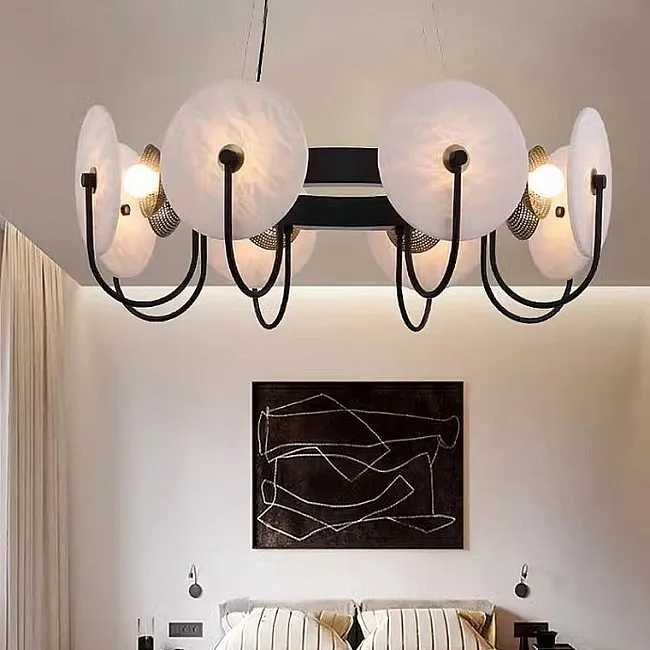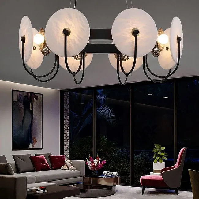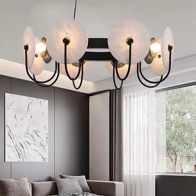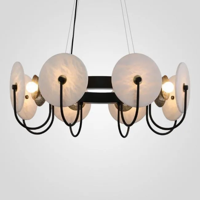 Серия кольцевых люстр на латунном каркасе с декоративными подвесками из испанского алебастра (мрамора) с выраженным природным рисунком