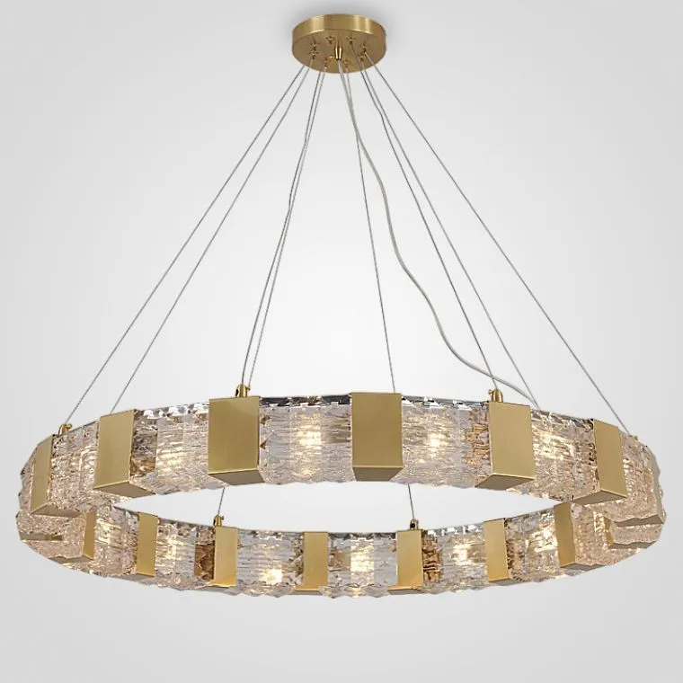 Серия кольцевых люстр с рельефными плафонами из стекла на кольцевом каркасе.