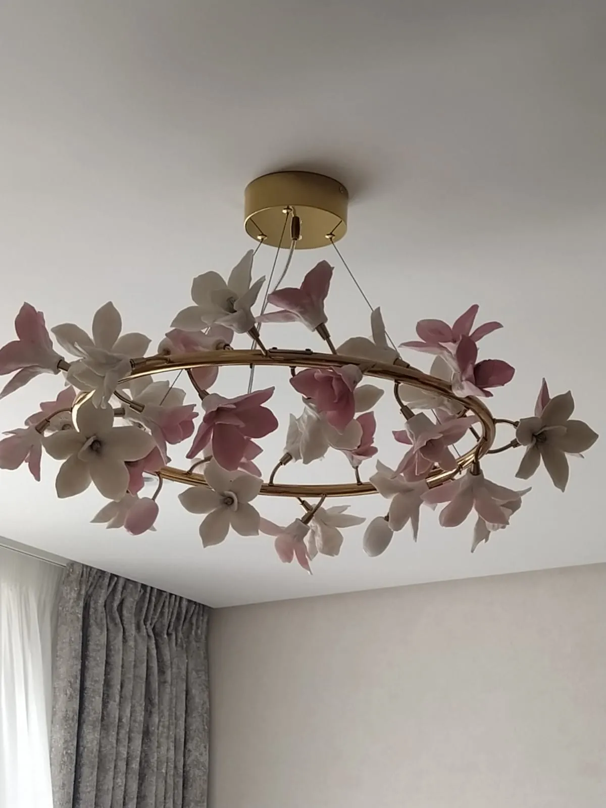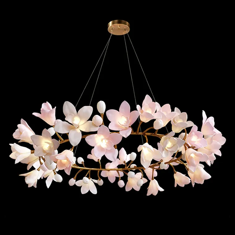 Серия кольцевых дизайнерских люстр с ветвистым абажуром с плафонами в виде цветов и бутонов из керамического фарфора