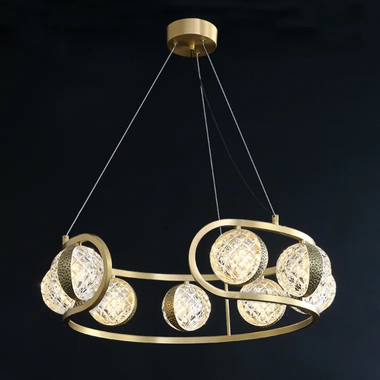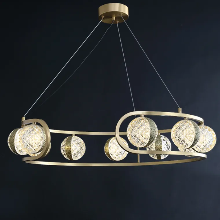 Серия кольцевых люстр с рельефными хрустальными плафонами шарообразной формы на разомкнутом кольцевом каркасе