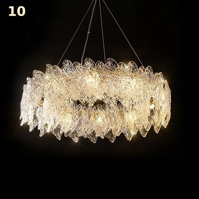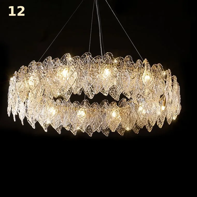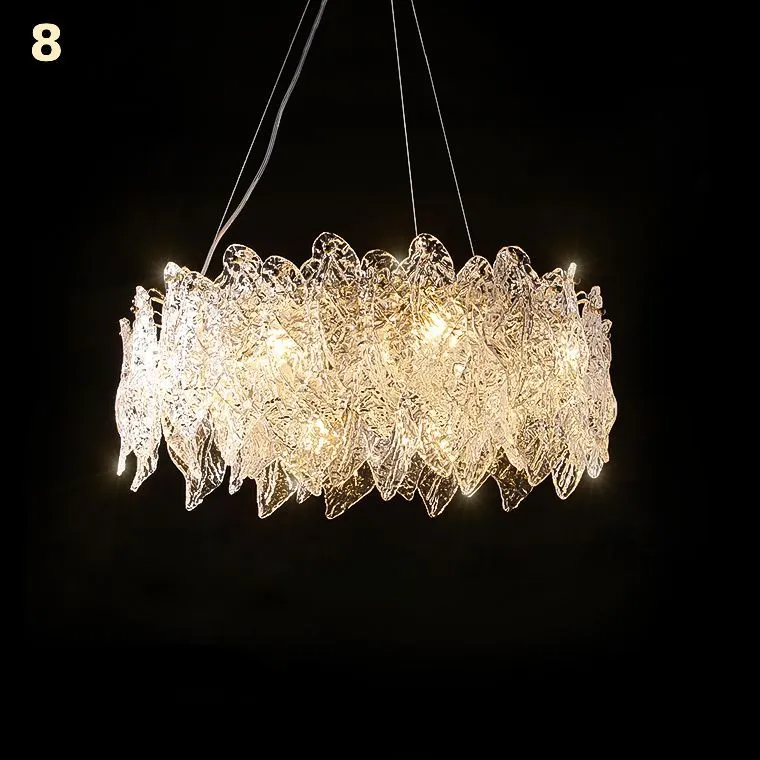 Корпус светильника выполнен в золотом цвете, добавляя еще больше шика и роскоши. Он отлично сочетается с рельефными стеклянными пластинами, создавая впечатление современности и превосходства. Струнный подвес и прозрачные подвески-пластины в виде листьев с детализированной текстурой придают светильнику еще больше изыска и очарования.