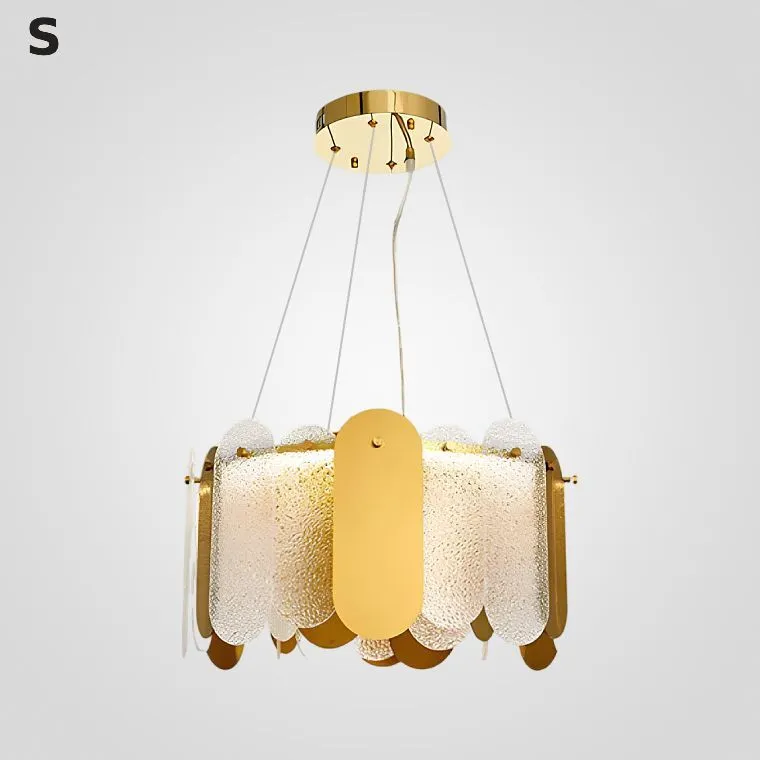 Эта кольцевая люстра, словно парящая в воздухе, обрамлена золотым каркасом, излучающим благородное сияние. Микс рассеивателей овальной формы, выполненных из фактурного прозрачного стекла и декоративных металлических пластин латунного цвета, добавят нотку изысканности в любой интерьер. Эти рассеиватели, расположенные в два слоя и в два ряда, создают неповторимый эффект многослойности, придавая свету объем и глубину.