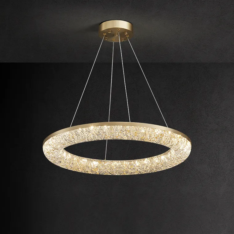 Серия светодиодных люстр с полупрозрачным рассеивателем с эффектом льда на кольцевом корпусе из латуни
