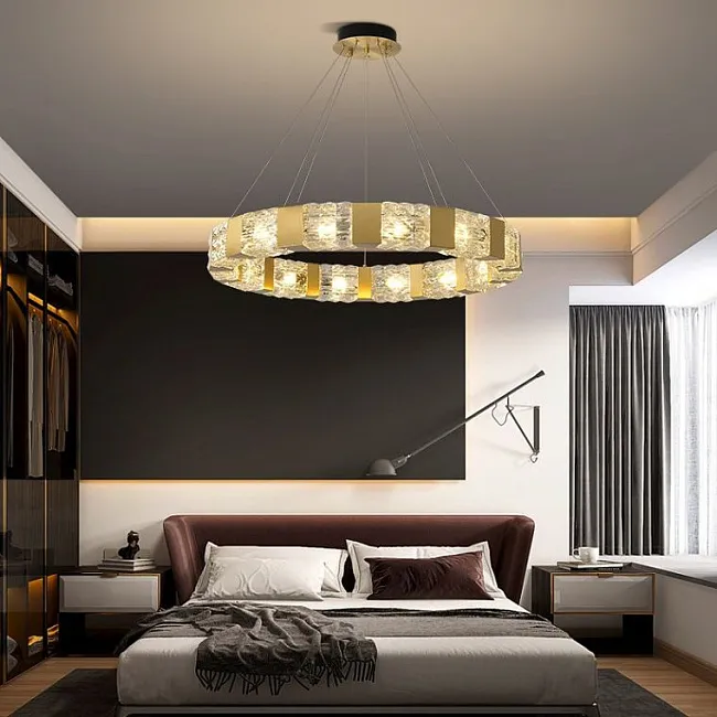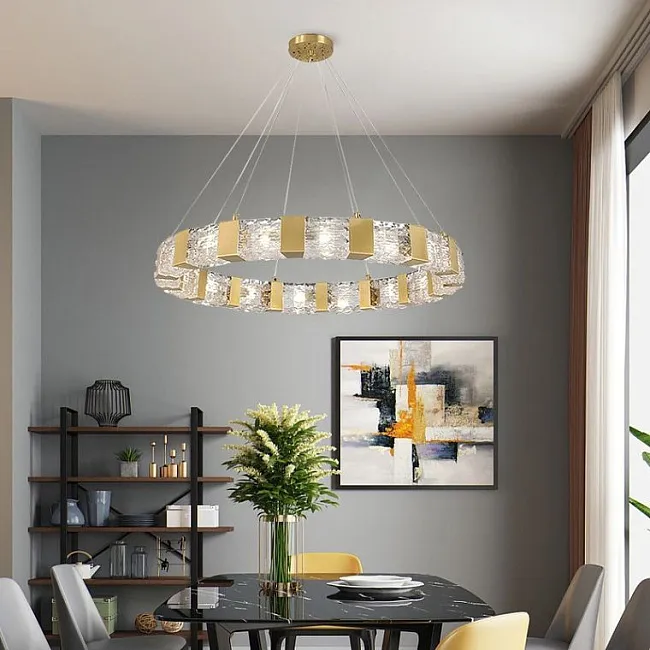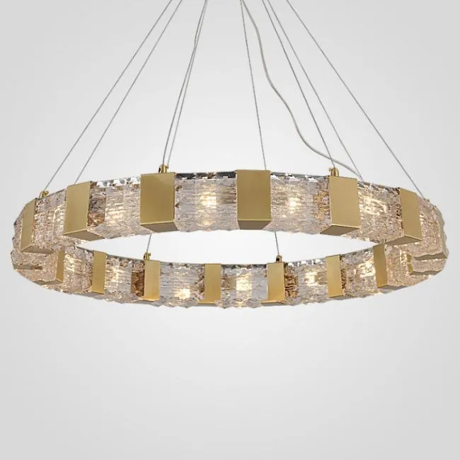 Каркас выполнен в латунном цвете, что добавляет шарма и изящности. А плафоны имеют форму кольца и доступны в двух вариантах цвета: серый дымчатый и прозрачный, что подойдет для любого интерьера.