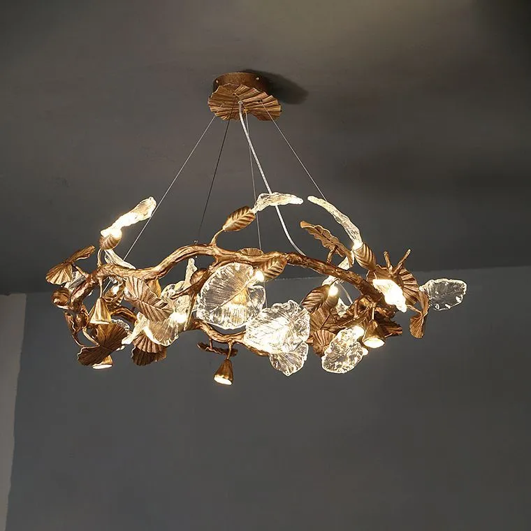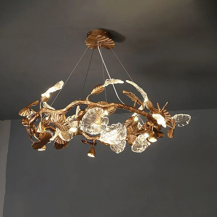 Представьте, как в вашем пространстве оживает магия природы, воплощенная в металле и стекле. Ветвистый каркас, словно древо, усеянный изысканными медными и стеклянными листьями, создает ощущение, будто в вашем доме поселился кусочек сказочного леса. Каждый листок, тщательно проработанный, играет с лучами света, рассыпая по комнате мягкие блики и тени.