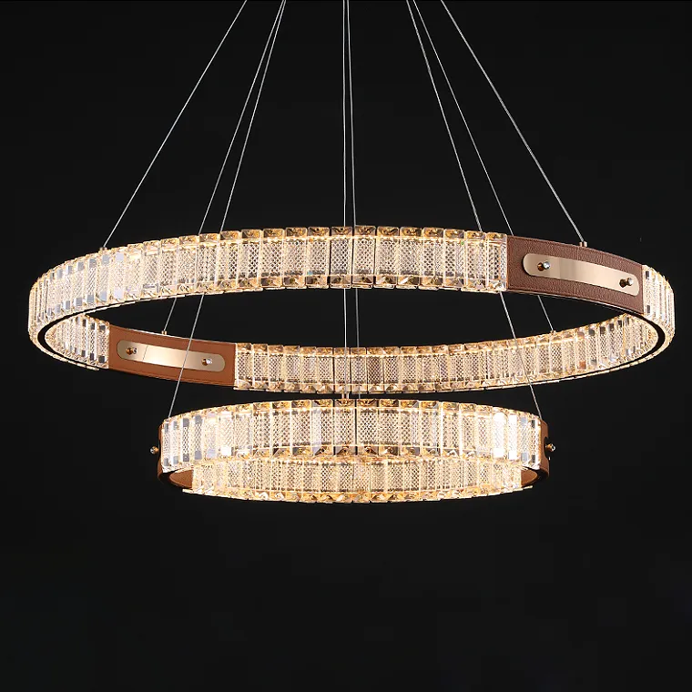 Серия светодиодных люстр в виде комбинации колец разного диаметра с хрустальными рассеивателями и кожаным декором