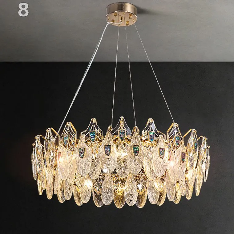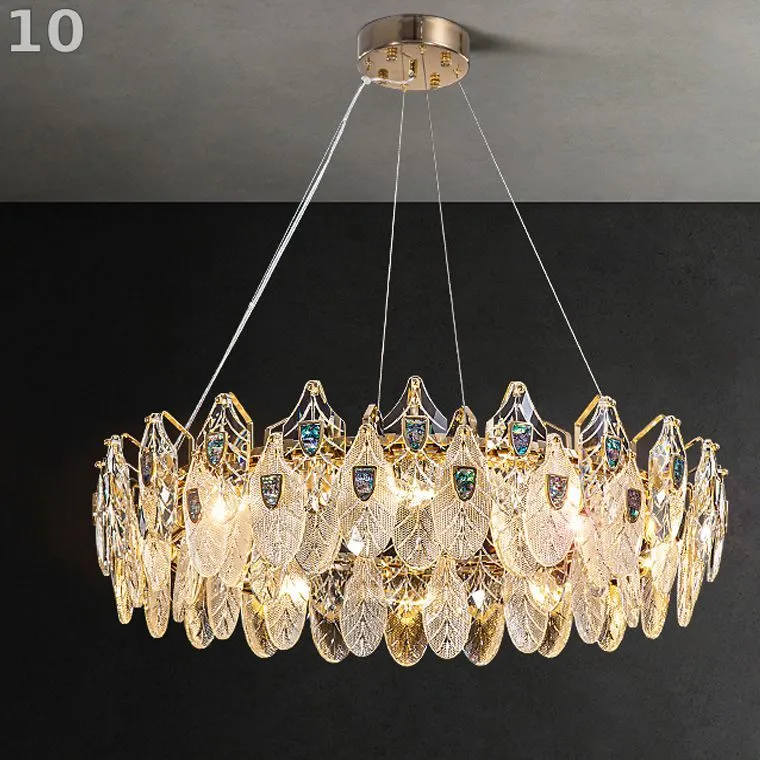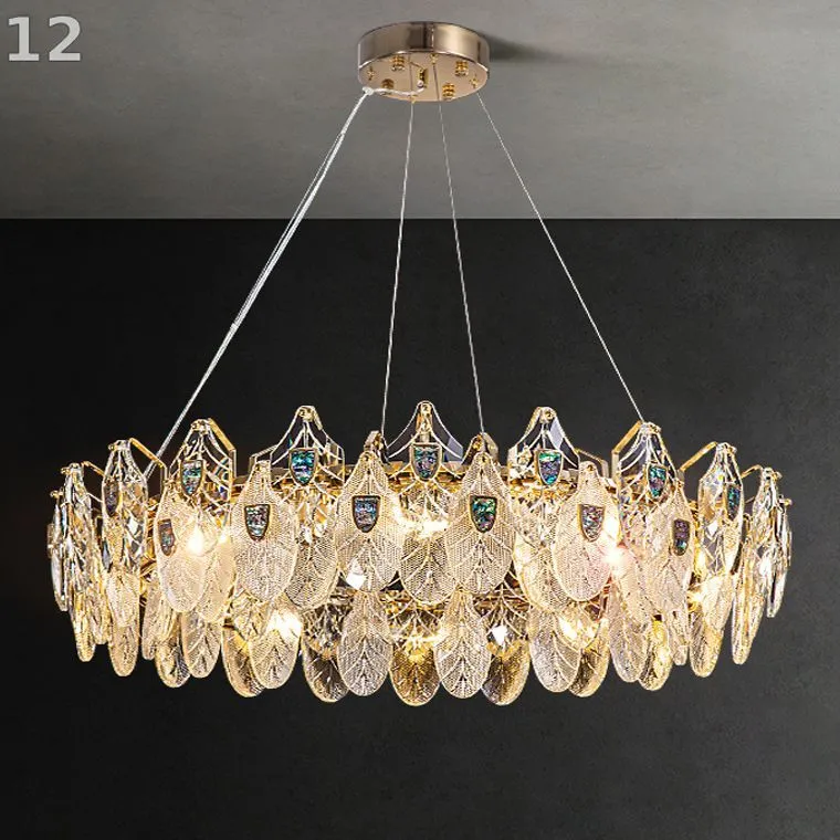 Новая серия люстр RAIMON представляет собой истинное произведение искусства и элегантности. Каждая люстра изготовлена из золотого каркаса и украшена хрустальными подвесками различной фактуры, стилизованными под листья. Благодаря тщательной детализации листья имеют прожилки, которые делают их более реалистичными.