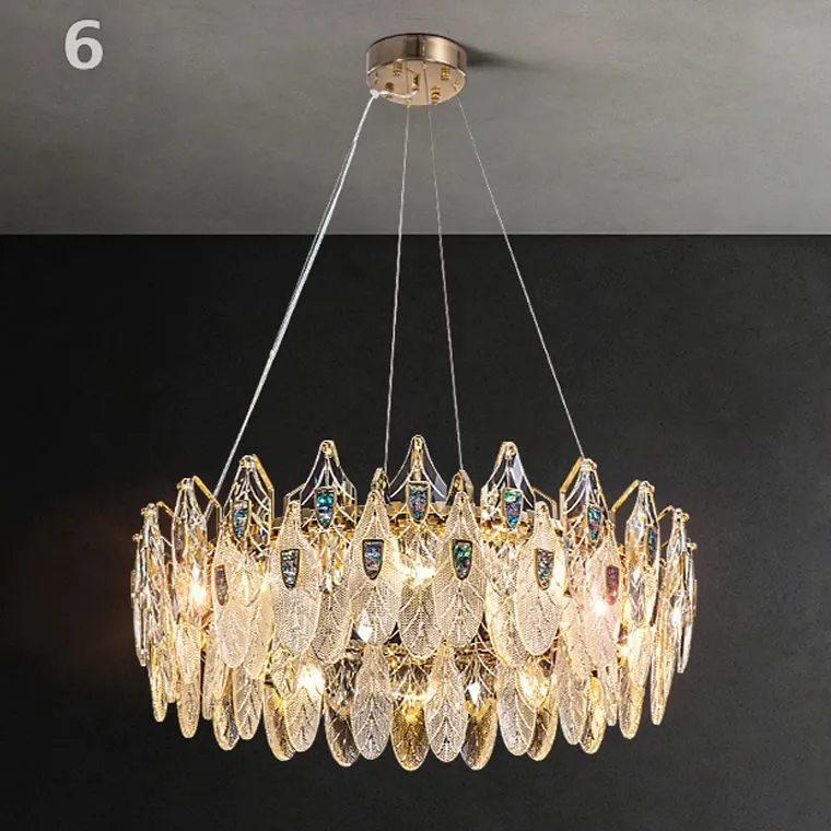 Особенностью этих люстр является наличие вставок из натурального перламутра на каждом листике в центре. Этот блестящий материал придает люстре неповторимость и создает игру света и отражений.