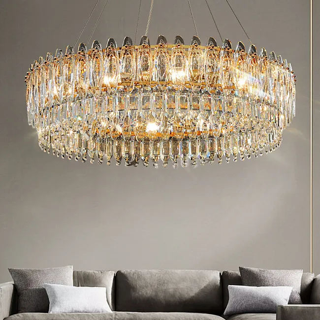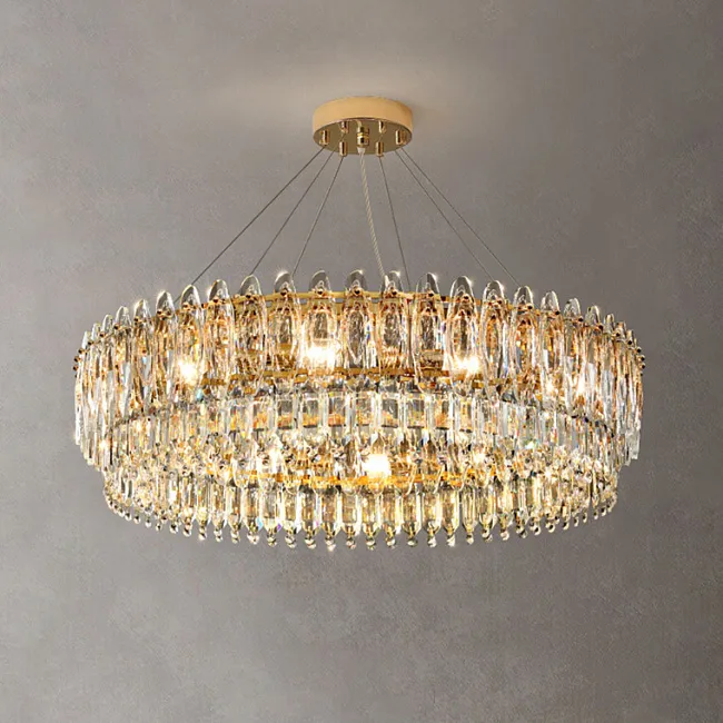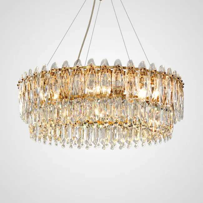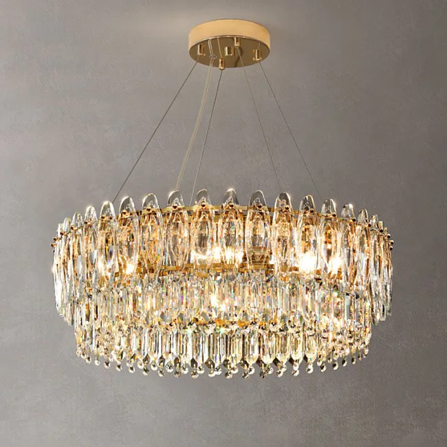 Новая серия люстр RAIMON представляет собой истинное произведение искусства и элегантности. Каждая люстра изготовлена из золотого каркаса и украшена хрустальными подвесками различной фактуры, стилизованными под листья. Благодаря тщательной детализации листья имеют прожилки, которые делают их более реалистичными.
