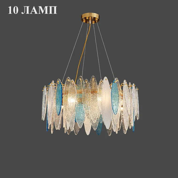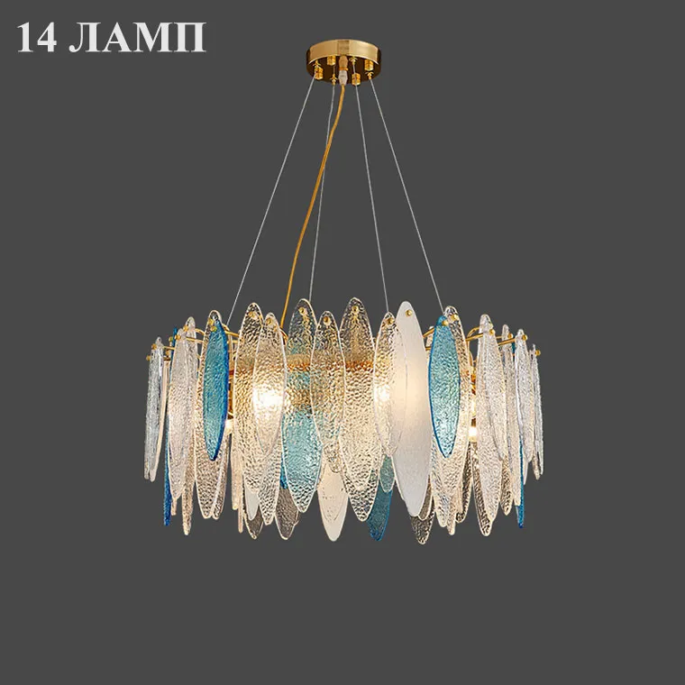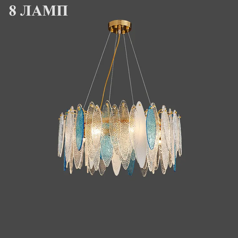 Кольцевая люстра со стеклянными прозрачными подвесками лепестками, голубыми и белыми вставками с фигурной поверхностью